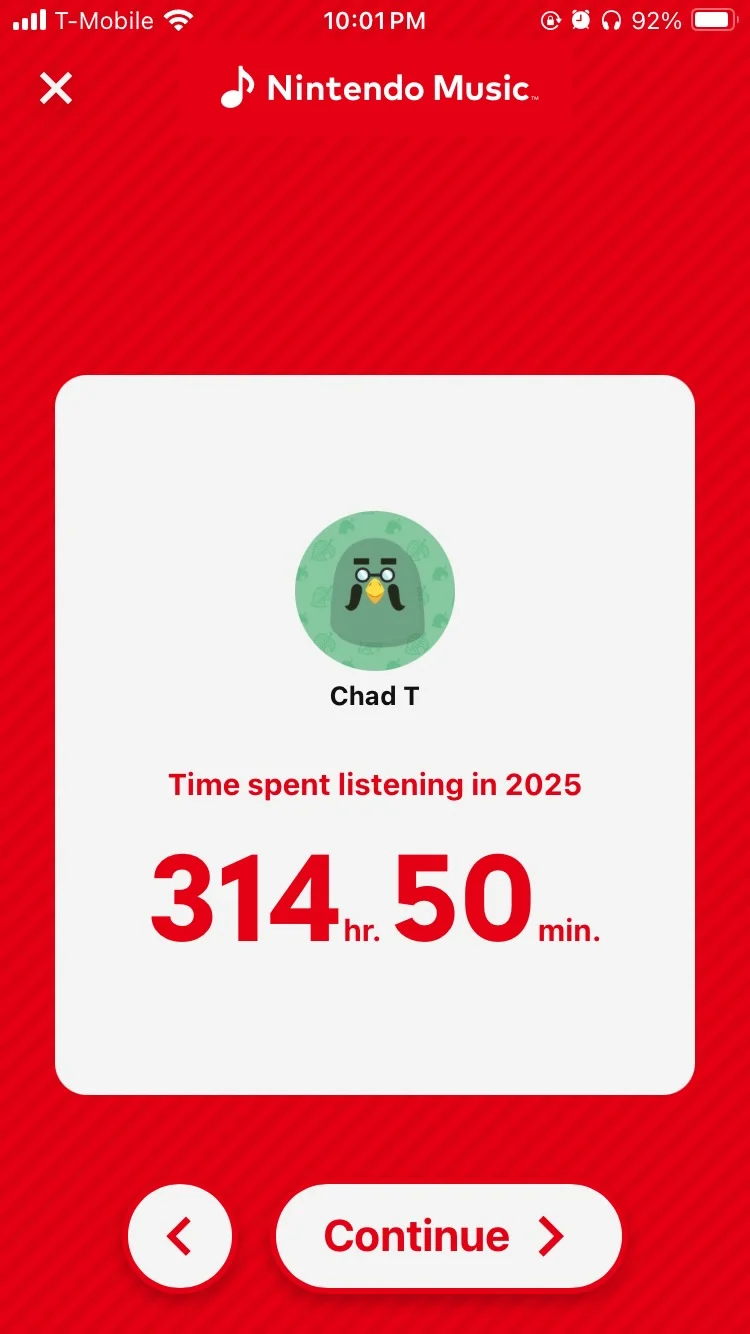 Nintendo Music launched in late 2024. Since then, I've been using it to listen to video game soundtracks—especially Zelda ambient music while working. Here are my 2025 listening stats (click to enlarge):